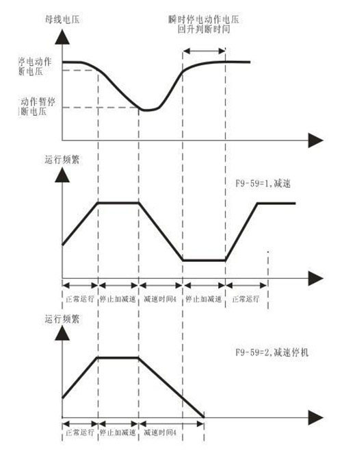 6.1此功能只在停電瞬間變頻器不會故障停機,而是降低輸出頻率,通過負載回饋能量,補充電壓降低,以維持變頻器短時間內繼續(xù)工作。