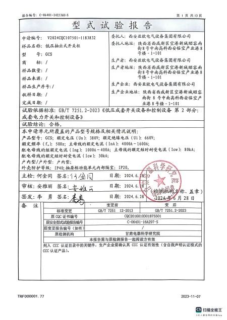 低壓抽出式開關(guān)柜(GCS)資質(zhì):